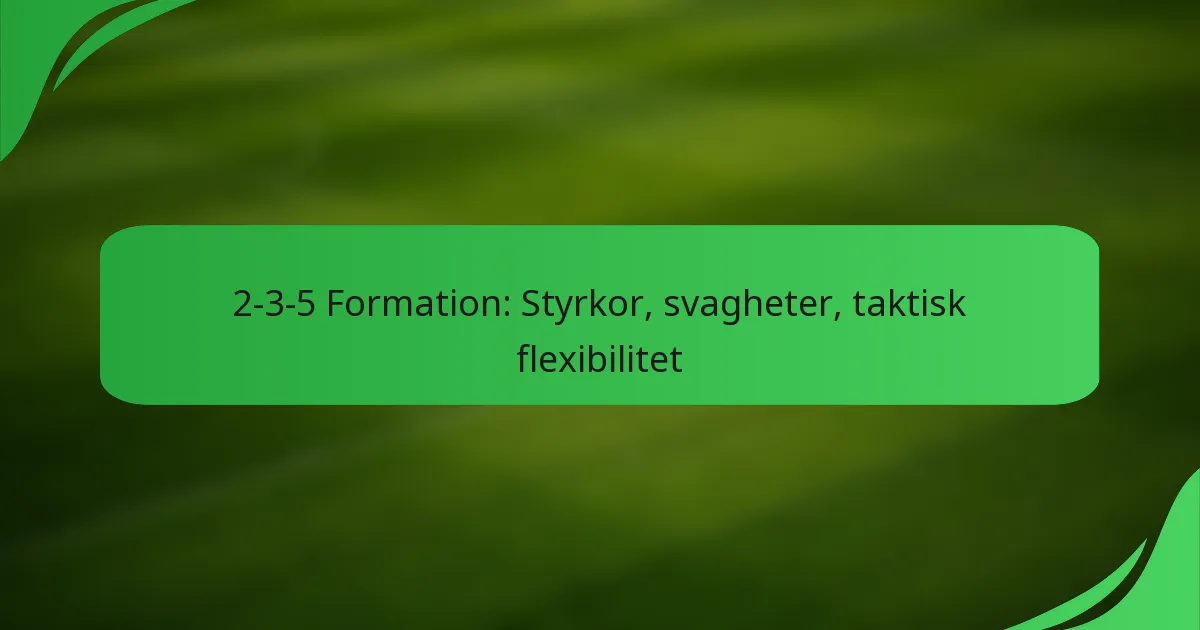 2-3-5-formationen är en klassisk fotbollsuppställning som har två försvarare, tre mittfältare och fem anfallare, vilket betonar offensivt spel och hög målpotential. Även om den möjliggör flytande spelarrörelser och effektiv utnyttjande av kanterna, har denna formation också svagheter som defensiva luckor och utmaningar med att upprätthålla kontrollen på mittfältet, vilket kan utnyttjas av motståndarna.